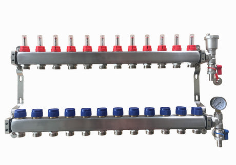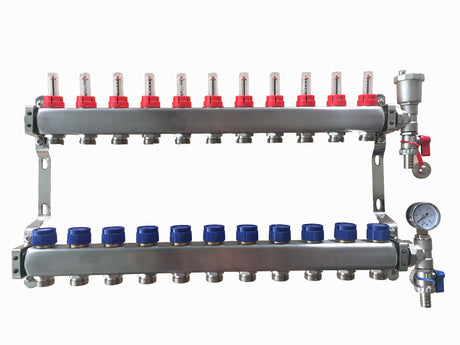 12 Port Stainless Steel Manifold Assembly - Pressure Gauge & Air Vent