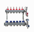 Premium pre-assembled stainless steel manifold for underfloor heating and radiator systems. Complete with auto air vent, 10 bar pressure gauge, flow meters (0-5 l/m), and fill/drain valves. Ready to install with 210mm flow/return spacing and 50mm port spacing.